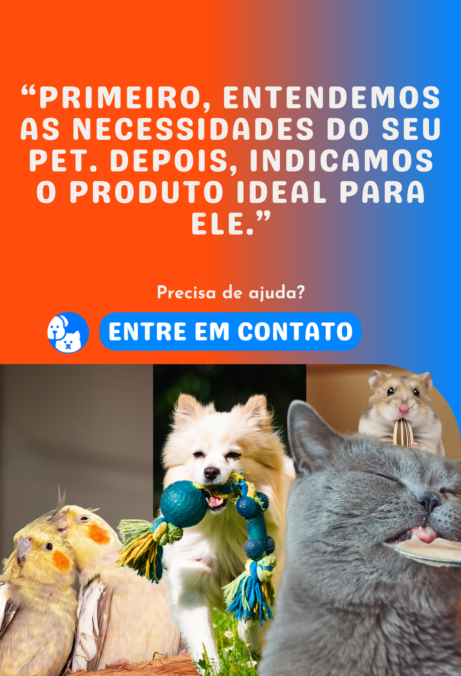 Depois indicamos o produto ideal para ele. Nada de vender por vender, nosso foco é o bem-estar e o cuidado certo para cada fase da vida do seu companheiro. -